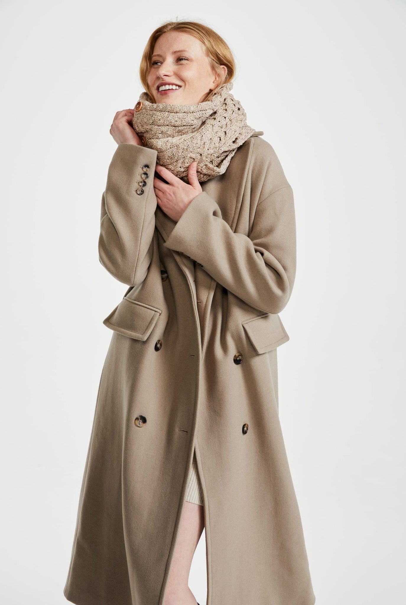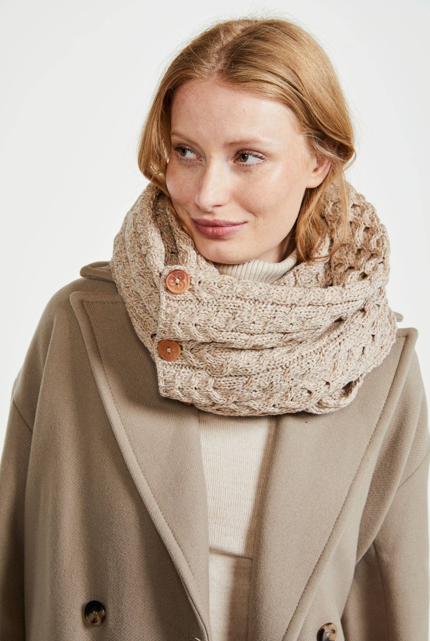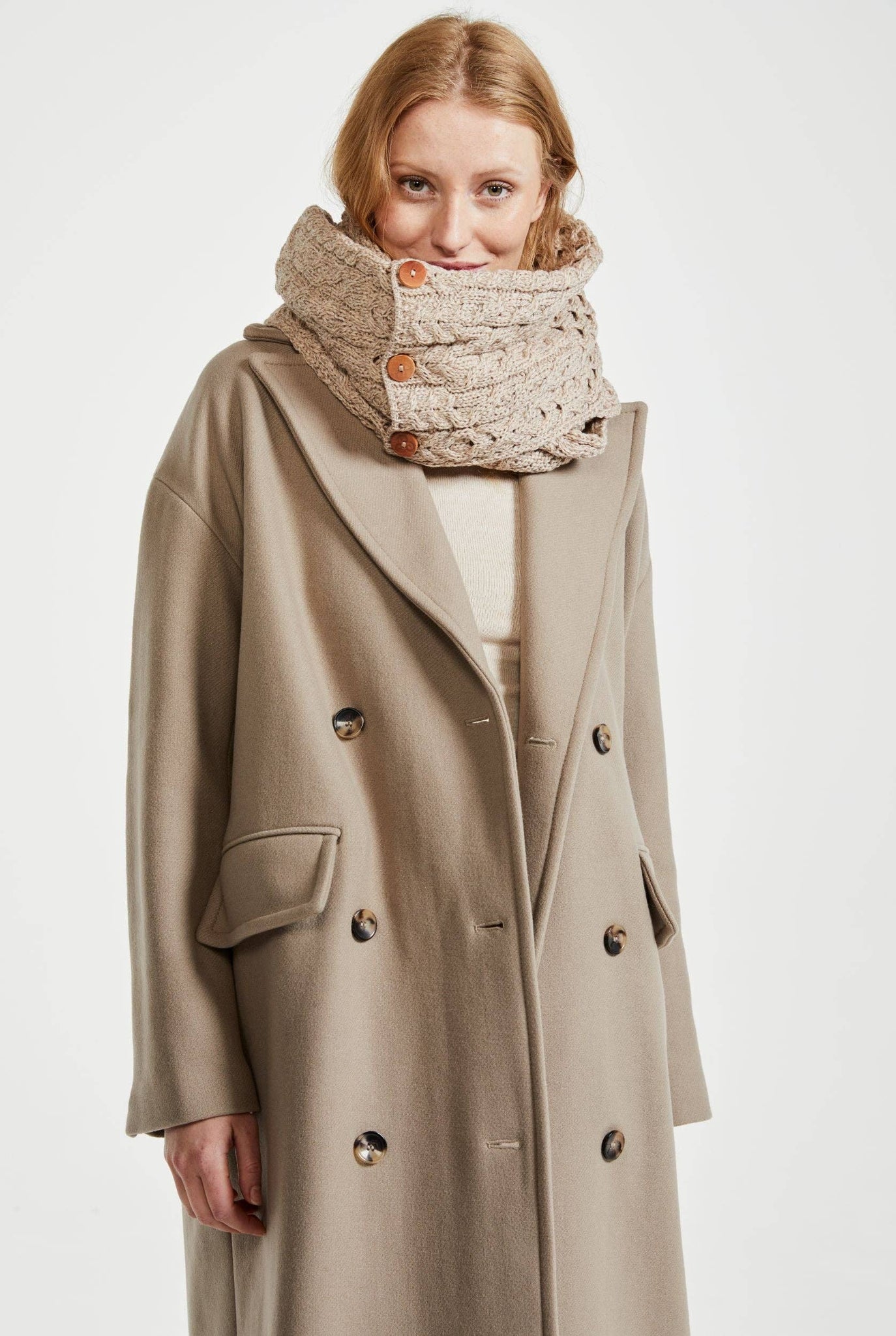 Lækkert dobbeltwrap-tørklæde strikket i blød og behagelig merinould. Super kvalitet med et unikt og tidsløst udtryk og en fin detalje med knapper i siden. Designet og produceret i irland med traditionelt kabelstrikket mønster.