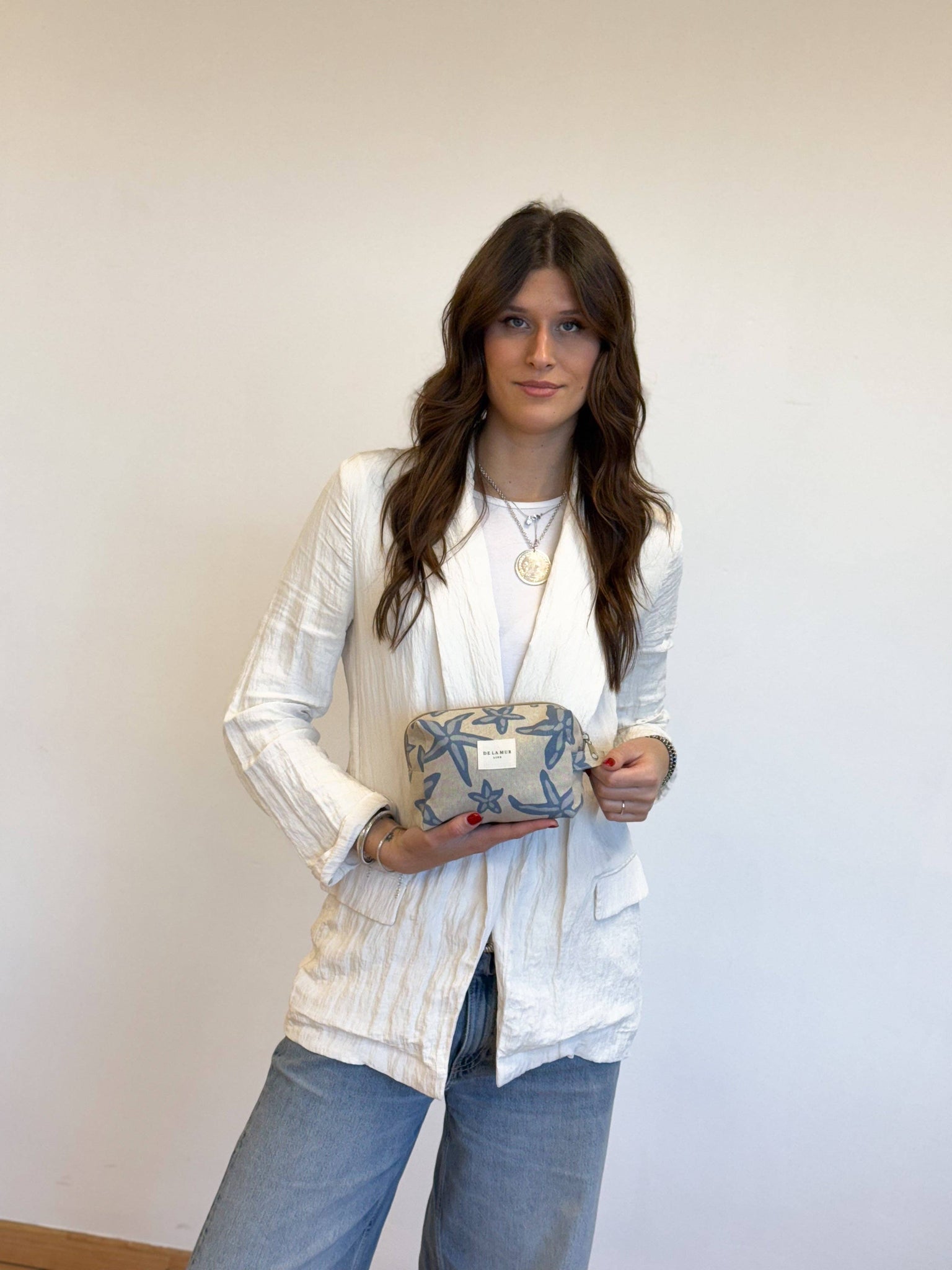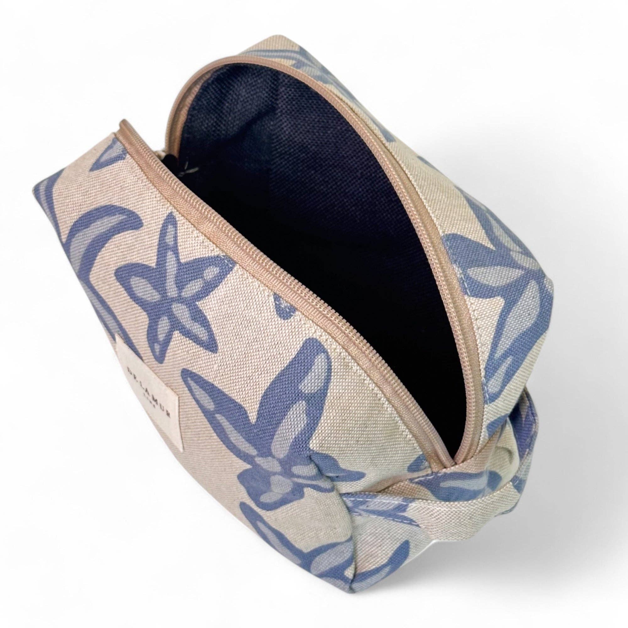 Mellemstor toilettaske med lynlås øverst og sideløkke. Lavet af fint half-panama stof med stjernemønster i blå nuancer. For korrekt vedligeholdelse anbefales det at vaske den koldt og undgå tørretumbler.